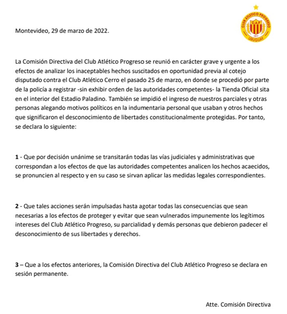 Progreso indicó que las acciones serán “impulsadas hasta agotar todas las consecuencias que sean necesarias a los efectos de proteger y evitar que sean vulnerados impunemente los legítimos intereses” del club y de la parcialidad. “La comisión directiva del Club Atlético Progreso se declara en sesión permanente”, culmina el comunicado.