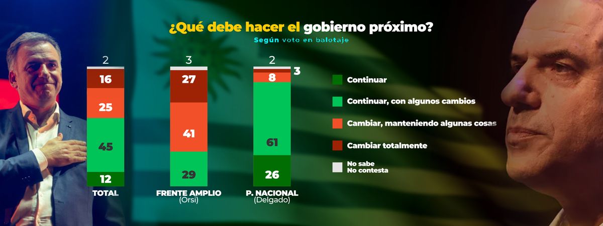 Entre los votantes del presidente electo, la demanda por cambios es más amplia, pero con diferentes intensidades: 27% apoya la idea de un “cambio total”, pero 41% se inclina más bien por “cambiar, manteniendo algunas cosas” (41%). Incluso, un 29% de los votantes de Orsi prefiere “continuar, con algunos cambios”.