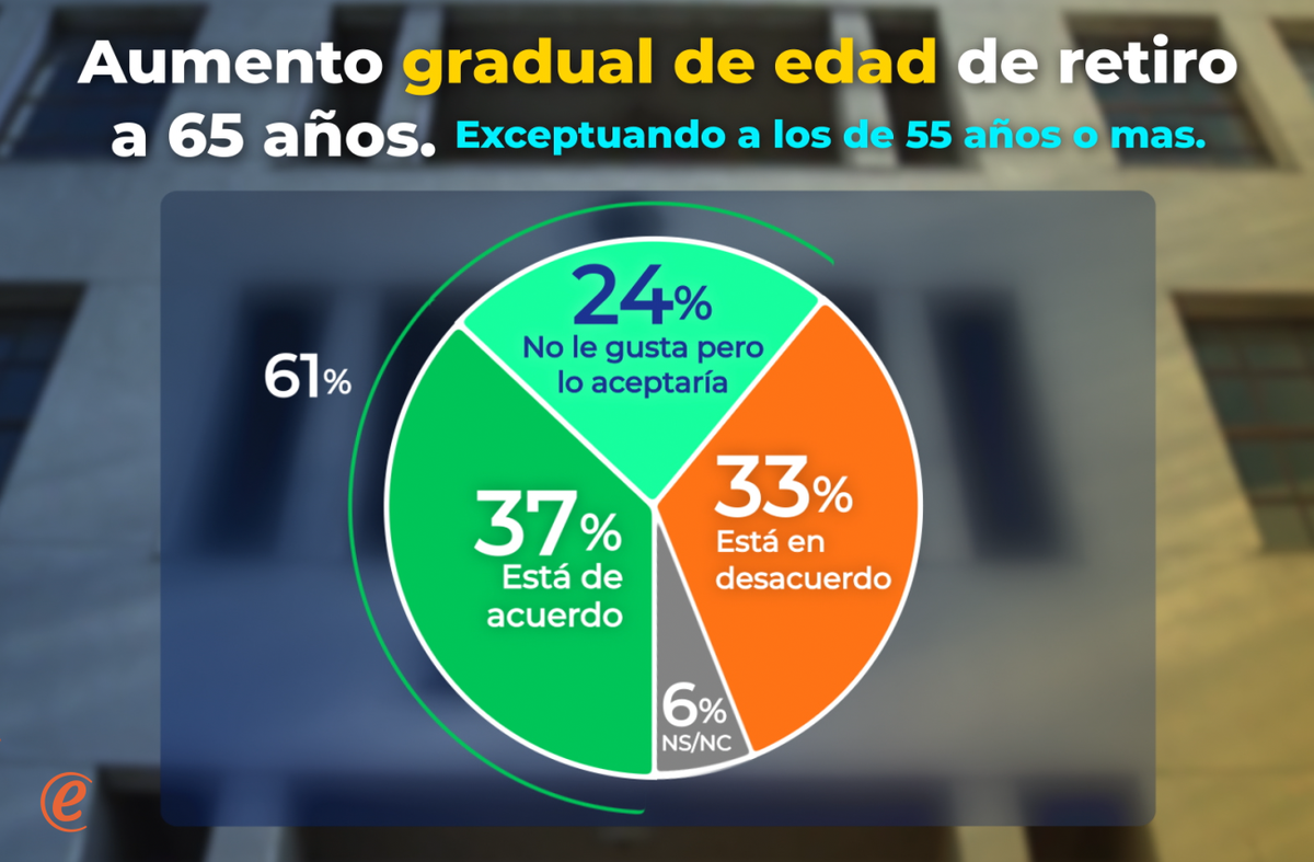 Cuando se consulta sobre esta modalidad de cambio en la edad jubilatoria normal, 37% se expresa de acuerdo y 24% dice que aunque “no le gusta” eso, “lo aceptaría”, por lo el nivel de aceptación de la medida, con este esquema de incremento de edad jubilatoria normal tiene 61% de aceptación.