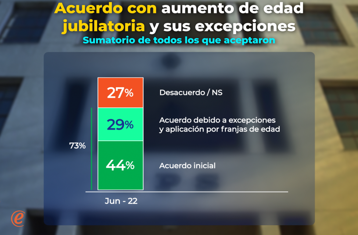 Como resumen, hay 44% de acuerdo con subir la edad de retiro para jubilación, a lo que se suma el porcentaje de uruguayos que está de acuerdo con las 4 excepciones analizadas, que es 29%, por lo que el nivel de aceptación de las medidas propuestas alcanza 73%. El restante 27% está en desacuerdo o no contesta.