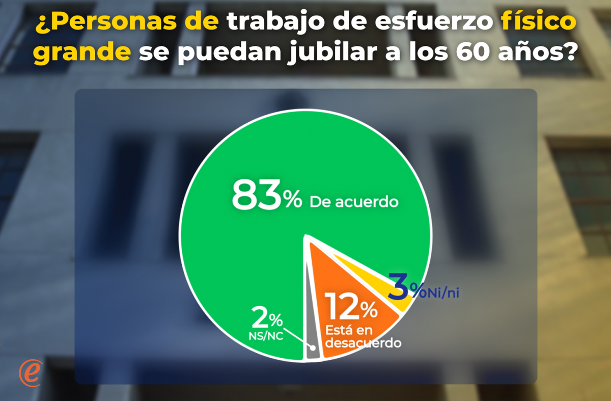 La propuesta de reforma incluye el mantenimiento de edad de retiro a los 60 años para aquellos que tienen trabajos con alta exigencia física. En este caso el nivel de aceptación de la medida es masivo: 83% acepta el establecimiento de esta excepción; mientras 12% no está de acuerdo, 3% da respuesta neutra y el restante 2% no contesta.