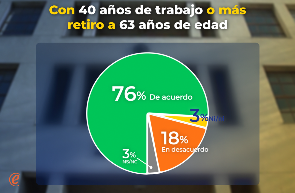 Otra excepción es para personas que tengan 40 años o más de trabajo, a los que se les permitirá jubilarse a partir de 63 años de edad. Con este cambio, 76% está de acuerdo, 18% en desacuerdo, 3% de respuestas neutras y 3% que no responde.