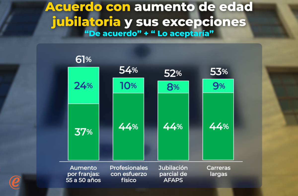 En el caso de “Aumento por franjas, gradual de 55 años”, hay 37% de acuerdo, más lo que aceptarían (24%) llega a 61%. En caso de Profesiones con esfuerzo físico, 44% aprueba y con 10% que lo aceptarías se llega a 54%. Para jubilación parcial de AFAP, se llega a 52%. Y para carreras largas, con 40 años de trabajo, el nivel de aceptación es de 53%.