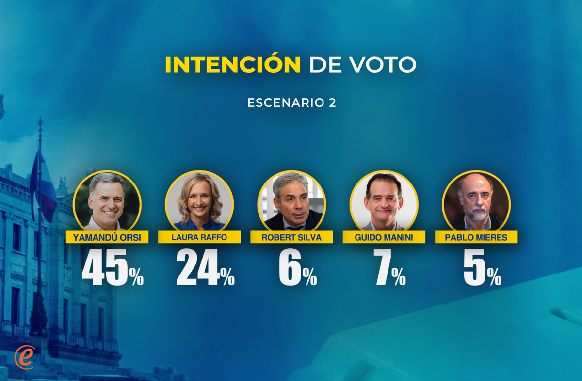 En un segundo escenario de competidores planteados son: Orsi por el FA; Laura Raffo por el PN, Robert Silva por el PC; Guido Manini Ríos por CA y Pablo Mieres por el PI. Allí, la intención de votos queda en: FA 45%; PN 24%; PC 6%; CA 7% y PI 5%.