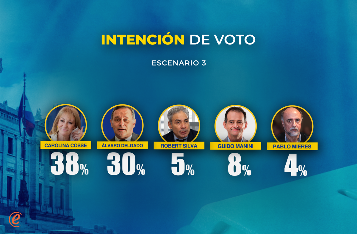 En el tercer escenario, los competidores que se le plantean a los encuestados son: Carolina Cosse por el FA; Álvaro Delgado por el PN; Robert Silva por el PC, Guido Manini Ríos por CA y Pablo Mieres por PI. En este caso, el FA tendría 38%; el PN 30%; el PC 5%; CA 8%; y PI 4%.