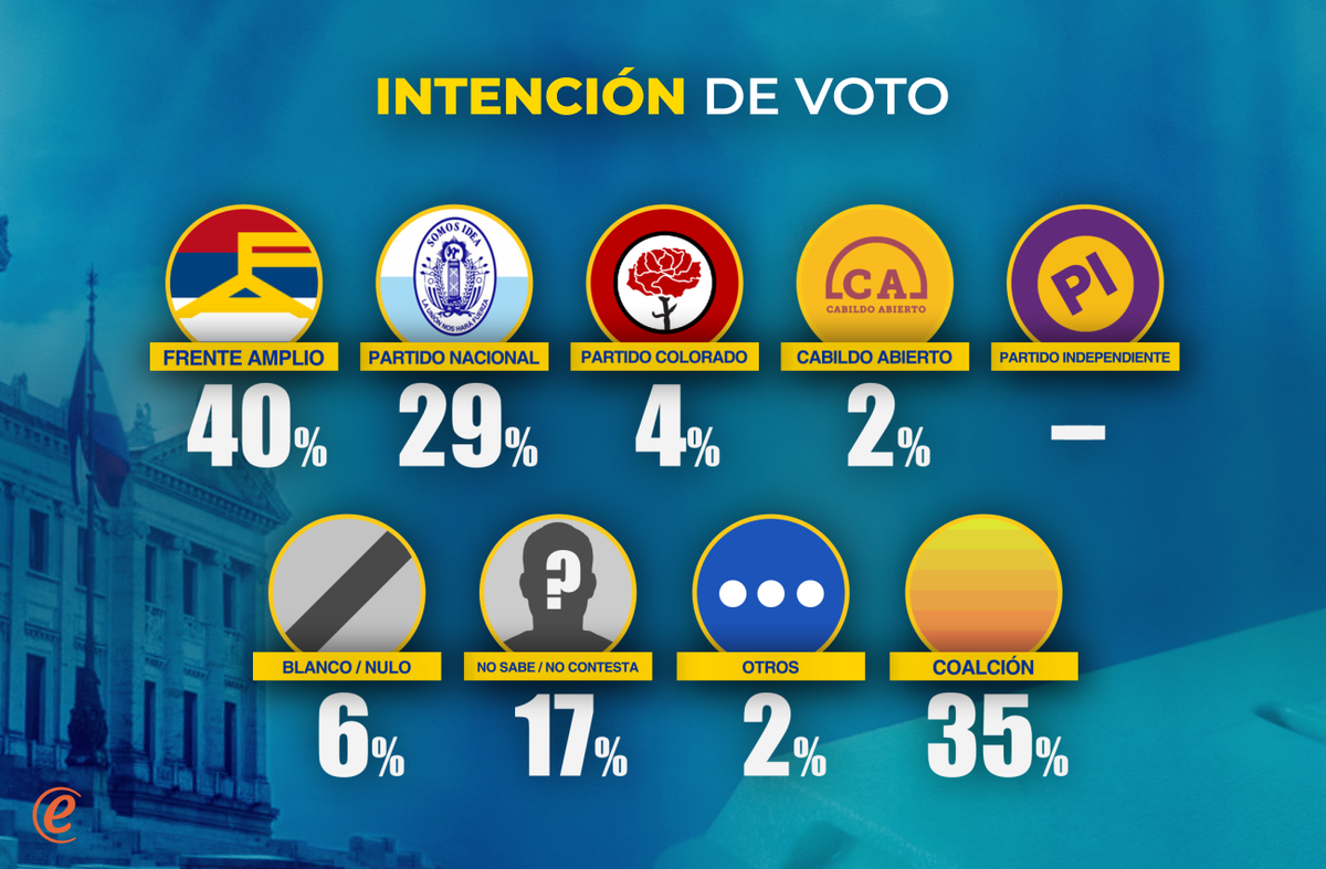 Un primer resultado da la intención de voto por partido. Cuando a la persona se le pregunta en general a qué partido votaría: FA 40%; PN 29%; PC 4%; CA 2%; PI menos de 1%; blanco o nulo 6%; 17% no sabe o no contesta y 2% dice otros partidos.