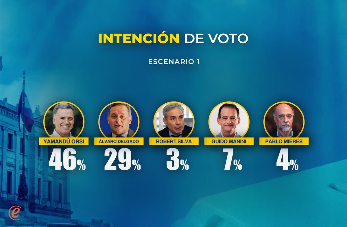 Luego, se plantea un posible escenario de competidores en una pregunta guiada. En un primer escenario, se le plantea a quién votaría si los competidores fueran: Yamandú Orsi por el FA, Álvaro Delgado por el PN; Robert Silva por el PC; Guido Manini Ríos por CA; y Pablo Mieres por el PI. En ese escenario, el FA tendría 46%; el PN 29%; el PC 3%; CA 7%; y el PI 4%.