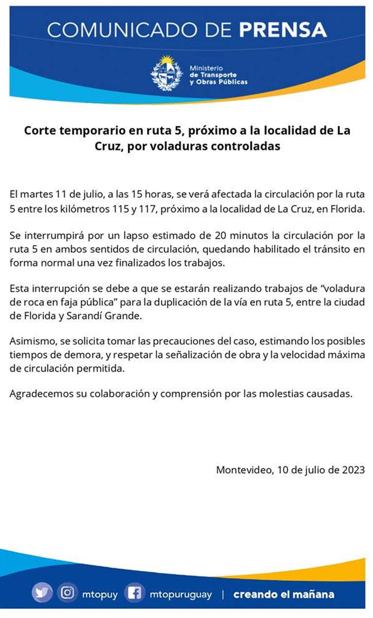 El Ministerio de Transporte y Obras Públicas (MTOP) advierte de “voladuras controladas ”, esta vez en ruta 5, próximo a la localidad de La Cruz, en Florida.