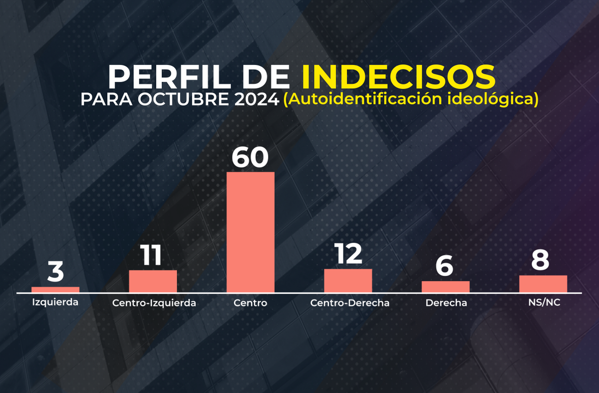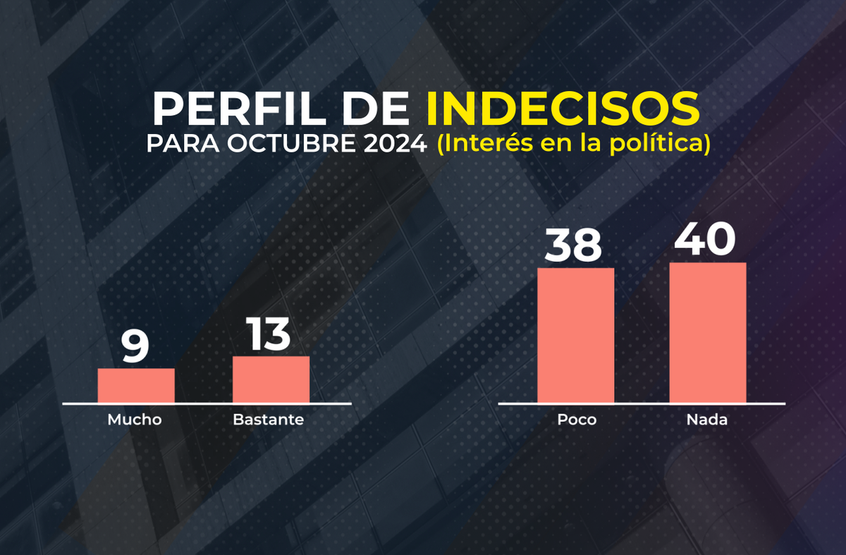 Finalmente, como suele ocurrir, los indecisos se consideran a sí mismos mayoritariamente de “centro” (60%), y solo sectores minoritarios tienen una orientación ideológica hacia la izquierda o la derecha. Adicionalmente, casi ocho de cada diez (78%) muestran “poco” o “nada” interés en la política.