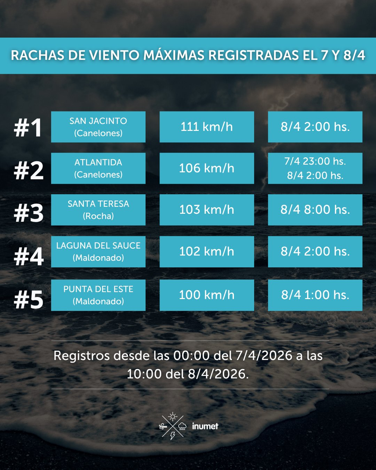 En Atlántida, también en Canelones, las rachas llegaron a 106 km/h, con registros a las 23:00 del martes y a las 2:00 del miércoles. En Santa Teresa, Rocha, el viento alcanzó los 103 km/h a las 8:00 del miércoles.