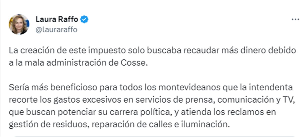 “Sería más beneficioso para todos los montevideanos que la intendenta recorte los gastos excesivos en servicios de prensa, comunicación y TV, que buscan potenciar su carrera política, y atienda los reclamos en gestión de residuos, reparación de calles e iluminación”, aseguró Raffo en Twitter.