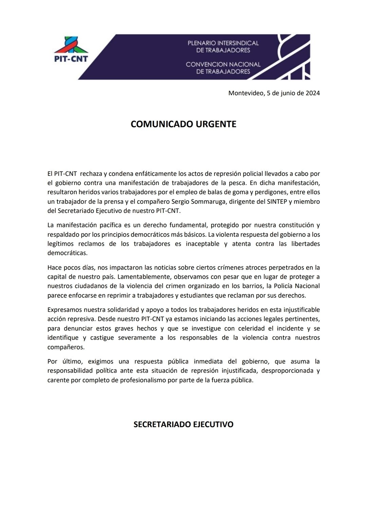 “En dicha manifestación, resultaron heridos varios trabajadores por el empleo de balas de goma y perdigones, entre ellos un trabajador de la prensa y el compañero Sergio Sommaruga, dirigente del SINTEP y miembro del Secretariado Ejecutivo de nuestro PIT-CNT”, denunció públicamente el PIT-CNT.