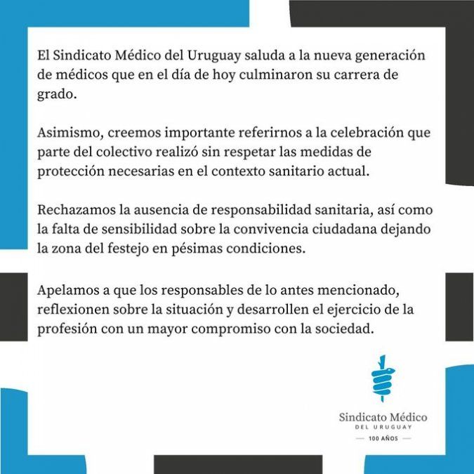 No obstante la convocatoria y el festejo se realizó en Parque Batlle este viernes, y en pocos minutos se viralizaron fotos y videos donde se veía a los flamantes médicos festejar sin tapabocas -en su mayoría- y aglomerados sin distanciamiento físico, en el marco de la pandemia de coronavirus y del foco en la salud que enfrenta Uruguay.