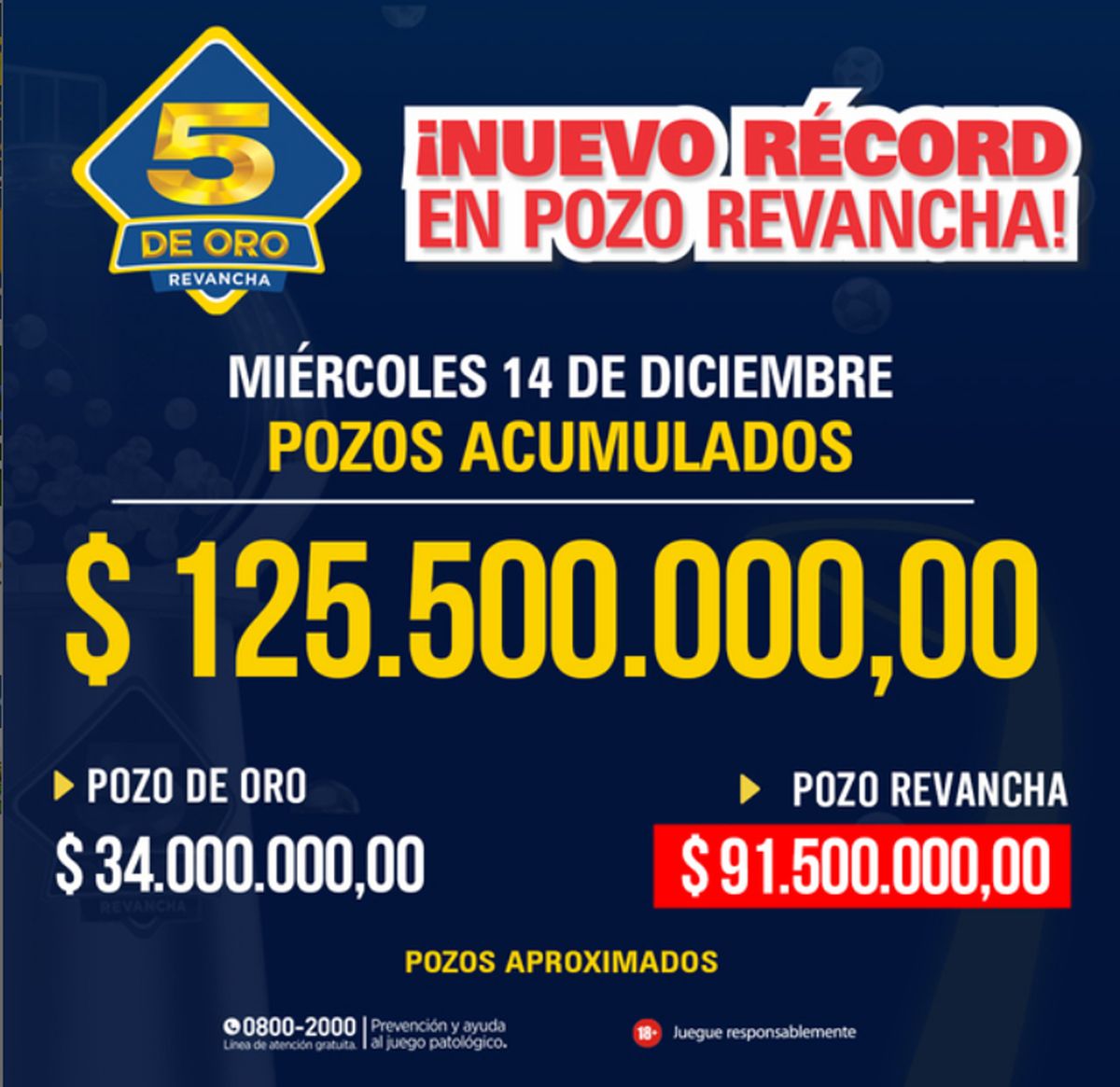 Este miércoles 14 se juega un 5 de Oro muy especial. Tras varias semanas sin salir, el Pozo Revancha supera largamente los 2 millones de dólares, lo que constituye un nuevo récord para esta opción del clásico 5 de Oro.