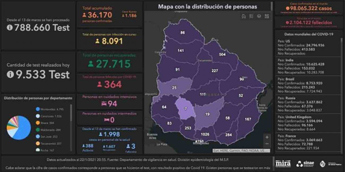 Según el último informe del SINAE actualmente hay 8.091 personas cursando la enfermedad, de las cuales 94 se encuentran internadas en cuidados intensivos. Hasta el momento, los 19 departamentos presentan casos activos.