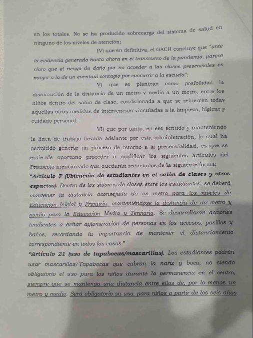 En primer lugar se determinó que a partir de ahora, en educación Inicial y Primaria, el distanciamiento de los alumnos dentro de las aulas será de un metro, en vez de un metro y medio como hasta ahora. Además anunció que a partir de los 6 años de edad será obligatorio el uso de tapabocas.