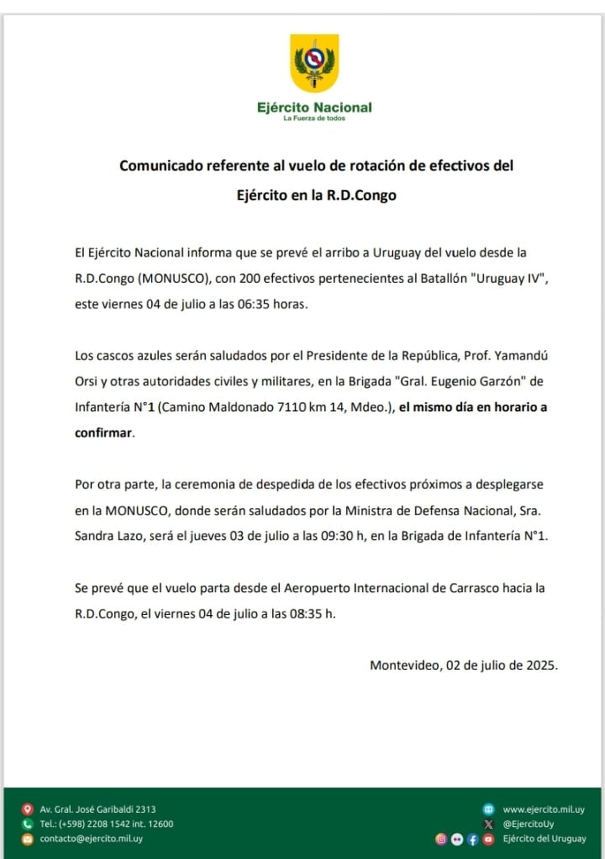 El Ejército Nacional informó este miércoles que la llegada de 200 militares uruguayos que están en el Congo está prevista para el viernes 4 de julio, a las 6:35 de la mañana.