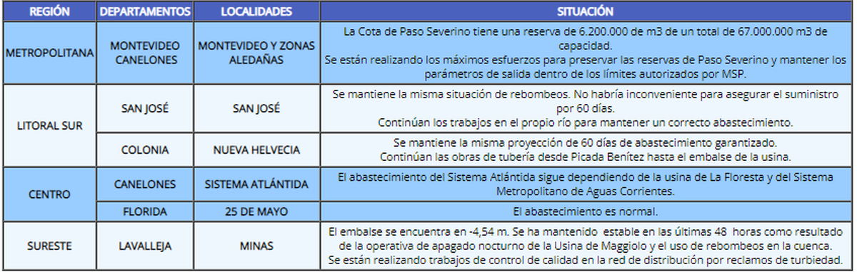 OSE divulgó el informe de situación del agua en las zonas más afectadas por la sequía, que incluye a Montevideo, San José, Nueva Helvecia, los balnearios que dependen del Sistema Atlántida, Minas y 25 de mayo, donde el abastecimiento es normal desde la semana pasada.