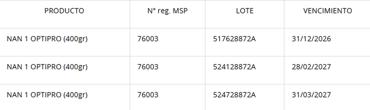 La fórmula es la NAN 1 OPTIPRO y el retiro se dio de forma preventiva luego de una comunicación de la empresa Nestlé Uruguay.