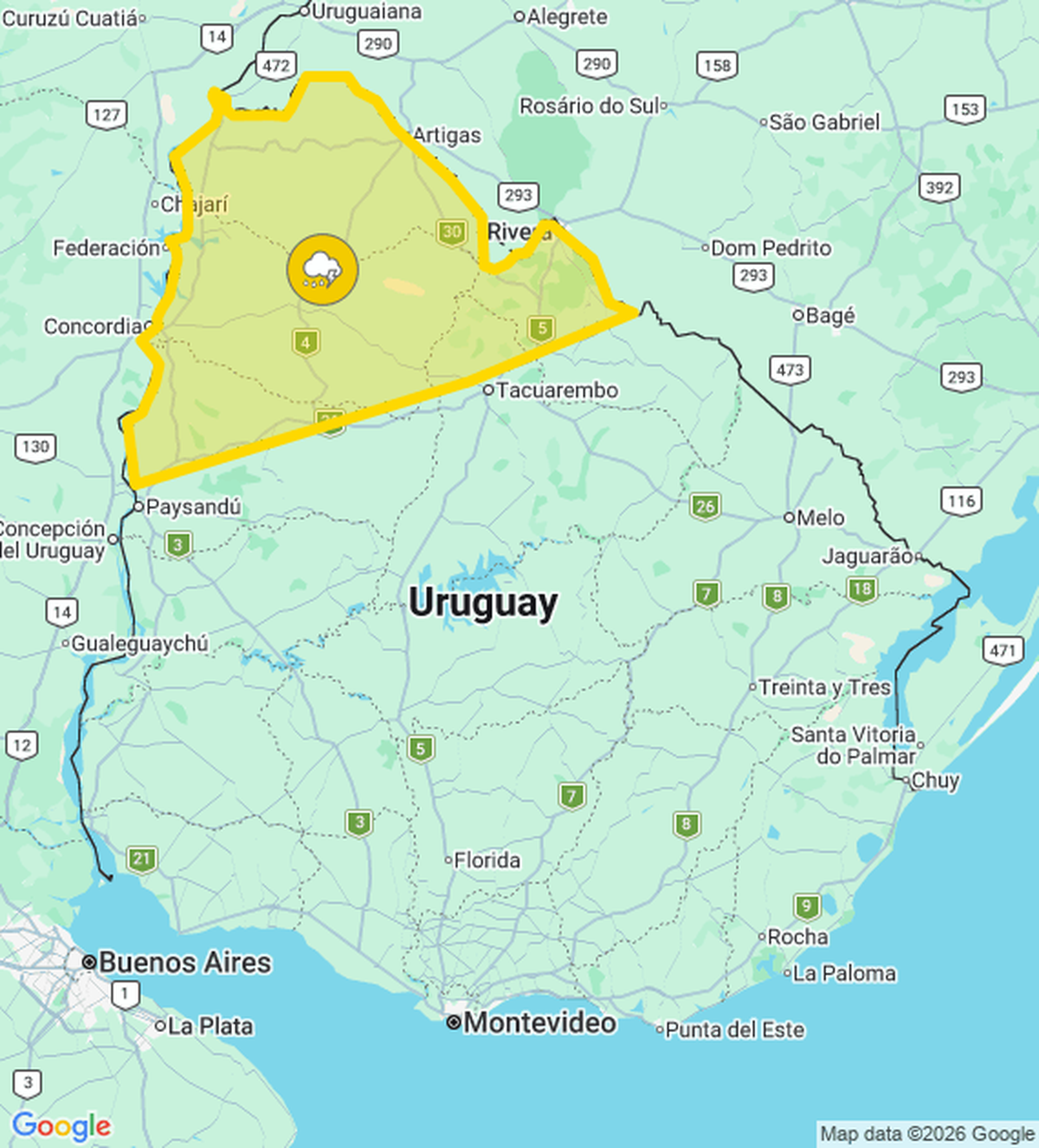 El Instituto Uruguayo de Meteorología (Inumet) emitió una advertencia amarilla por tormentas puntualmente fuertes y lluvias abundantes. Se actualizará a la hora 12:40.
