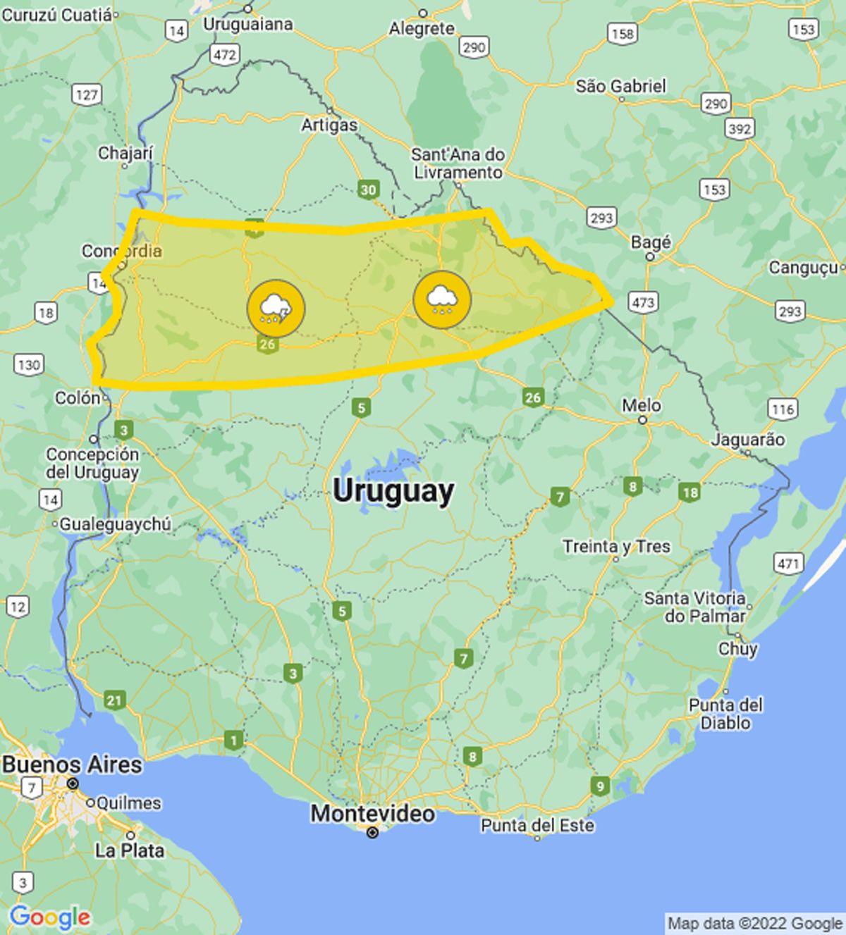 El Instituto Uruguayo de Meteorología publicó este viernes de mañana una alerta amarilla por persistencia de tormentas y lluvias, especialmente para la zona norte del país.