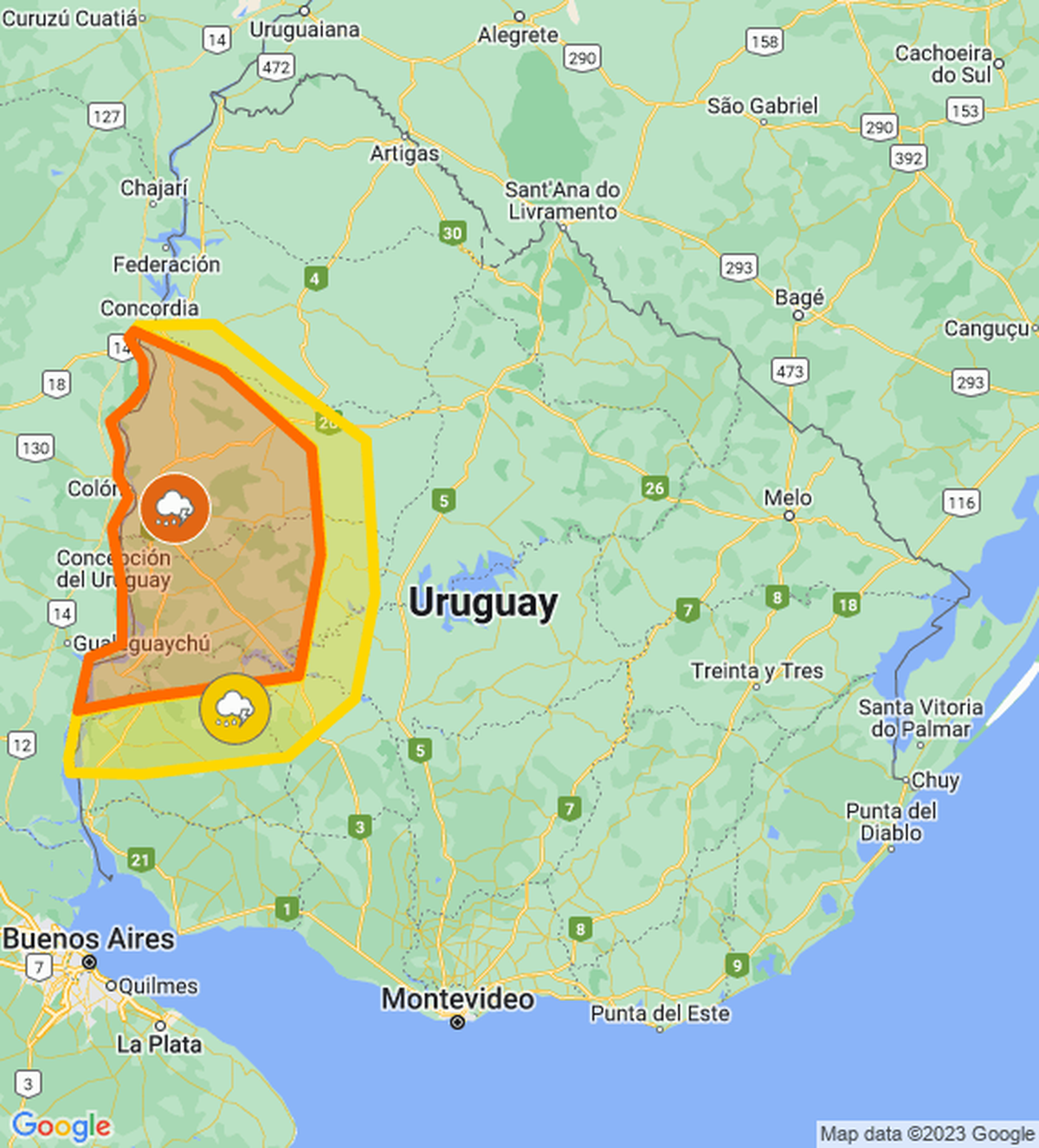 El Instituto Uruguayo de Meteorología (Inumet) extendió las alertas meteorológicas vigentes naranja y amarilla por tormentas fuertes.