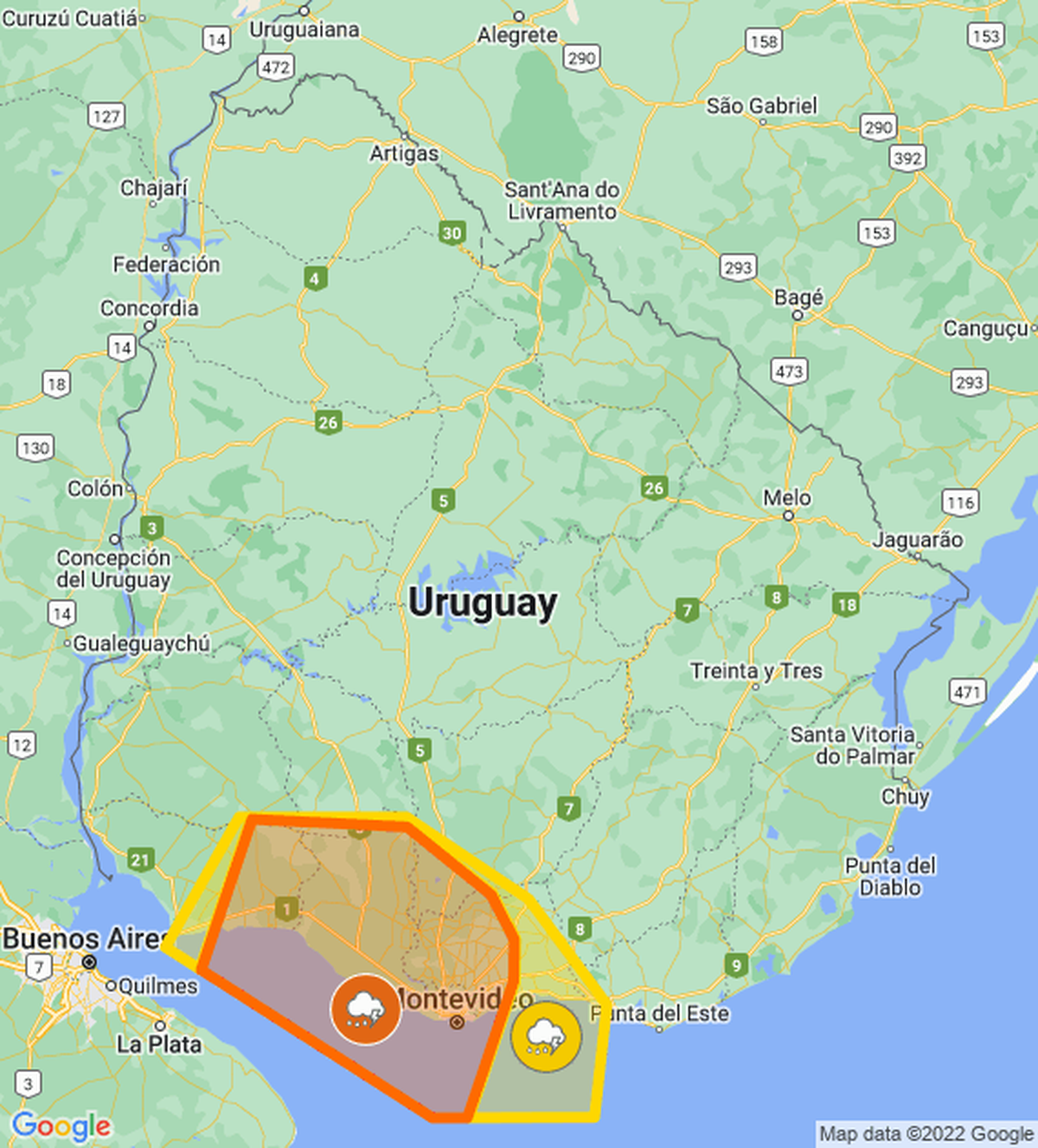 Meteorología emitió alerta naranja y amarilla por tormentas fuertes y lluvias intensas para algunos departamentos del sur del país.