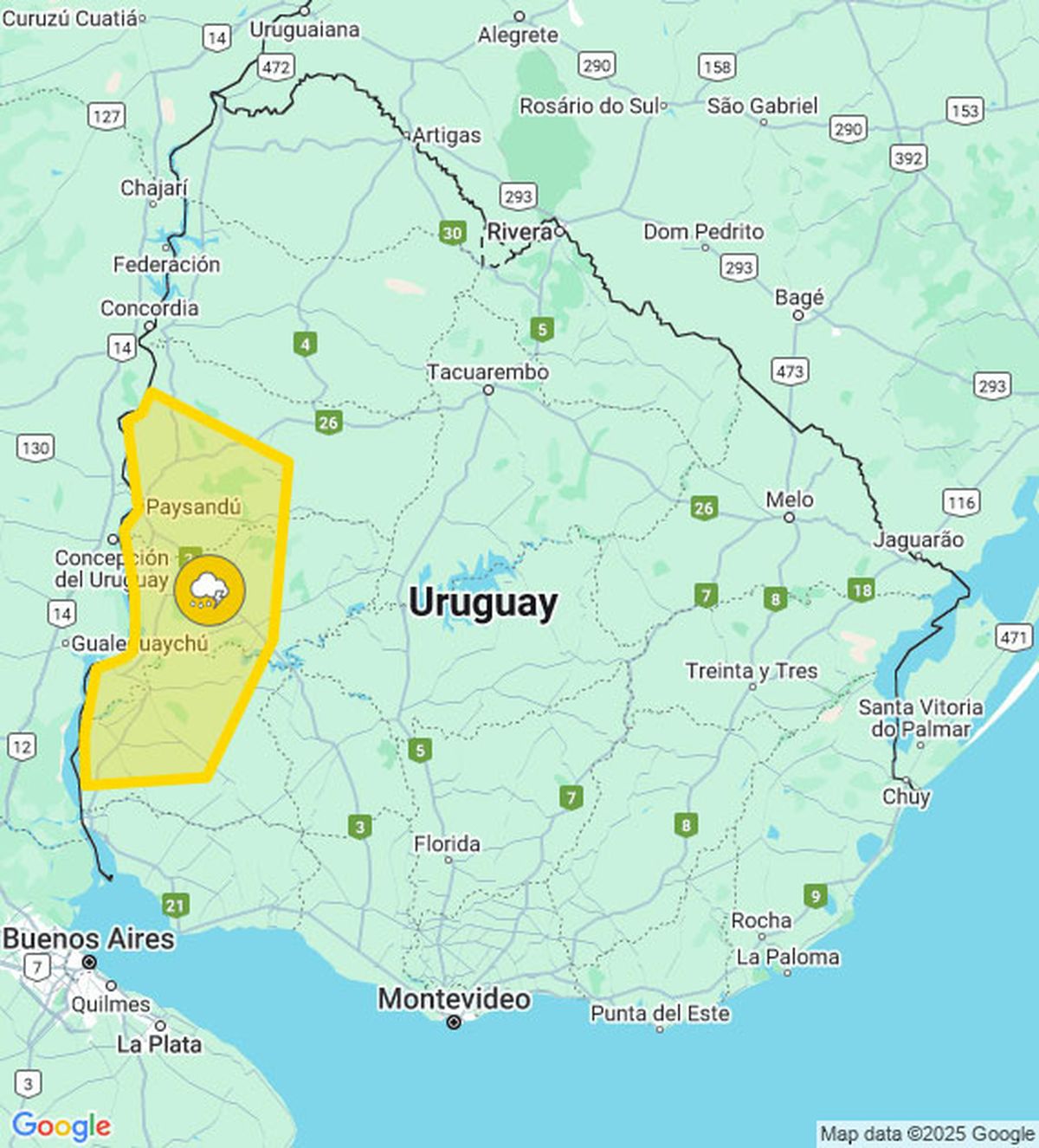 El Instituto Uruguayo de Meteorología (Inumet) publica este lunes de mañana una alerta amarilla por tormentas fuertes y lluvias intensas para una zona del litoral oeste, (ver mapa abajo).
