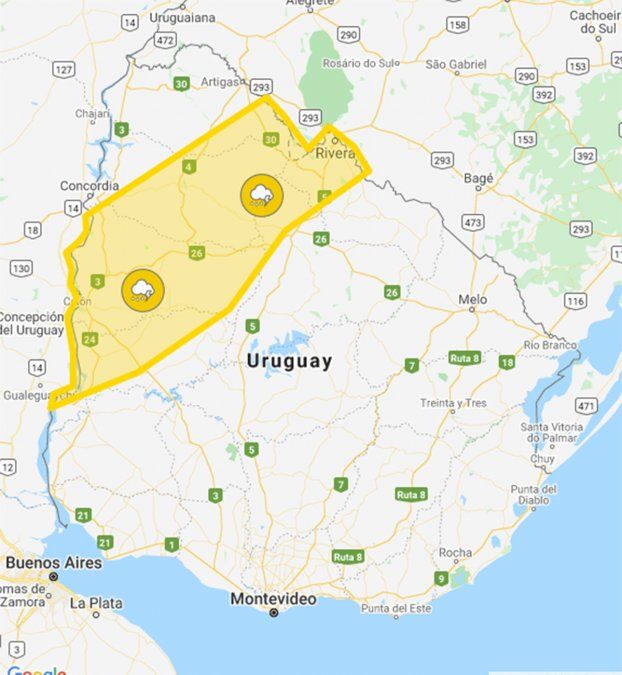 El Instituto Uruguayo de Meteorología (Inumet) publicó una alerta amarilla por tormentas fuertes para una franja del norte del país, desde el litoral (Río Negro) hasta Rivera y Artigas.