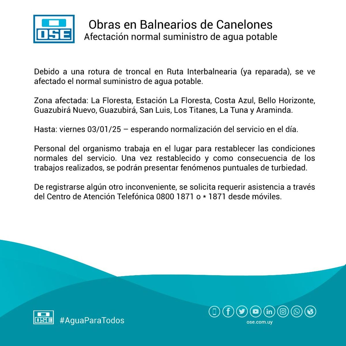 Desde OSE, recuerdan que una vez restablecido el suministro se podrán presentar fenómenos puntuales de turbiedad como consecuencia de los trabajos realizados. Ante algún inconveniente o en caso de requerir asistencia, se deberá comunicar al Centro de Atención Telefónica 0800 1871 o *1871 desde celulares.