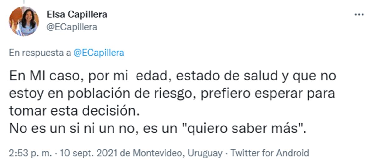 La diputada de Cabildo Abierto, Elsa Capillera, aún no se vacunó contra el Covid-19 y este viernes dio sus razones a través de las redes sociales.