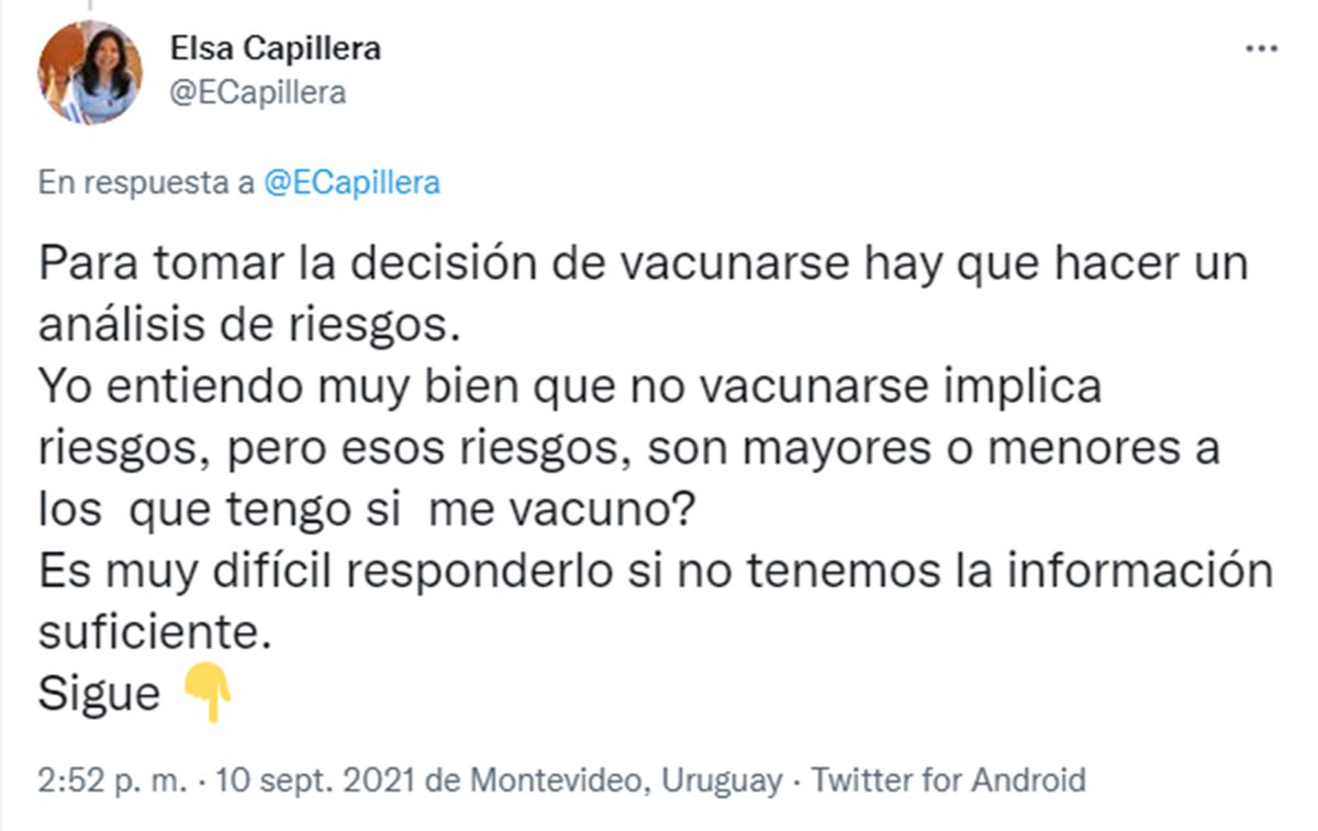 “Para tomar la decisión de vacunarse hay que hacer un análisis de riesgos”, argumenta la diputada por Montevideo. “Yo entiendo muy bien que no vacunarse implica riesgos, pero esos riesgos, son mayores o menores a los que tengo si me vacuno?”, se pregunta. “Es muy difícil responderlo si no tenemos la información suficiente”, acota.