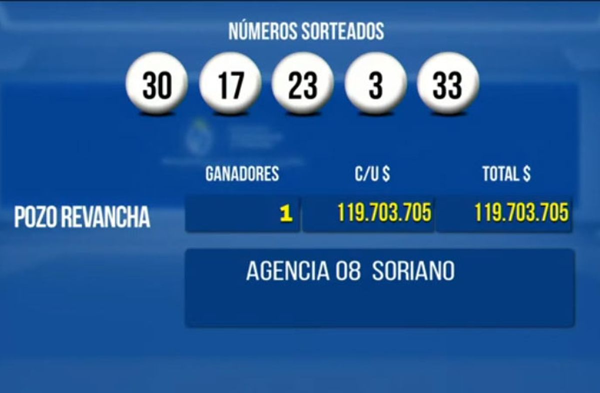 El jueves finalmente salió, y los números ganadores son: 03 – 17 – 23 – 30 y 33. La jugada ganadora se vendió en la agencia número 8 de Soriano.