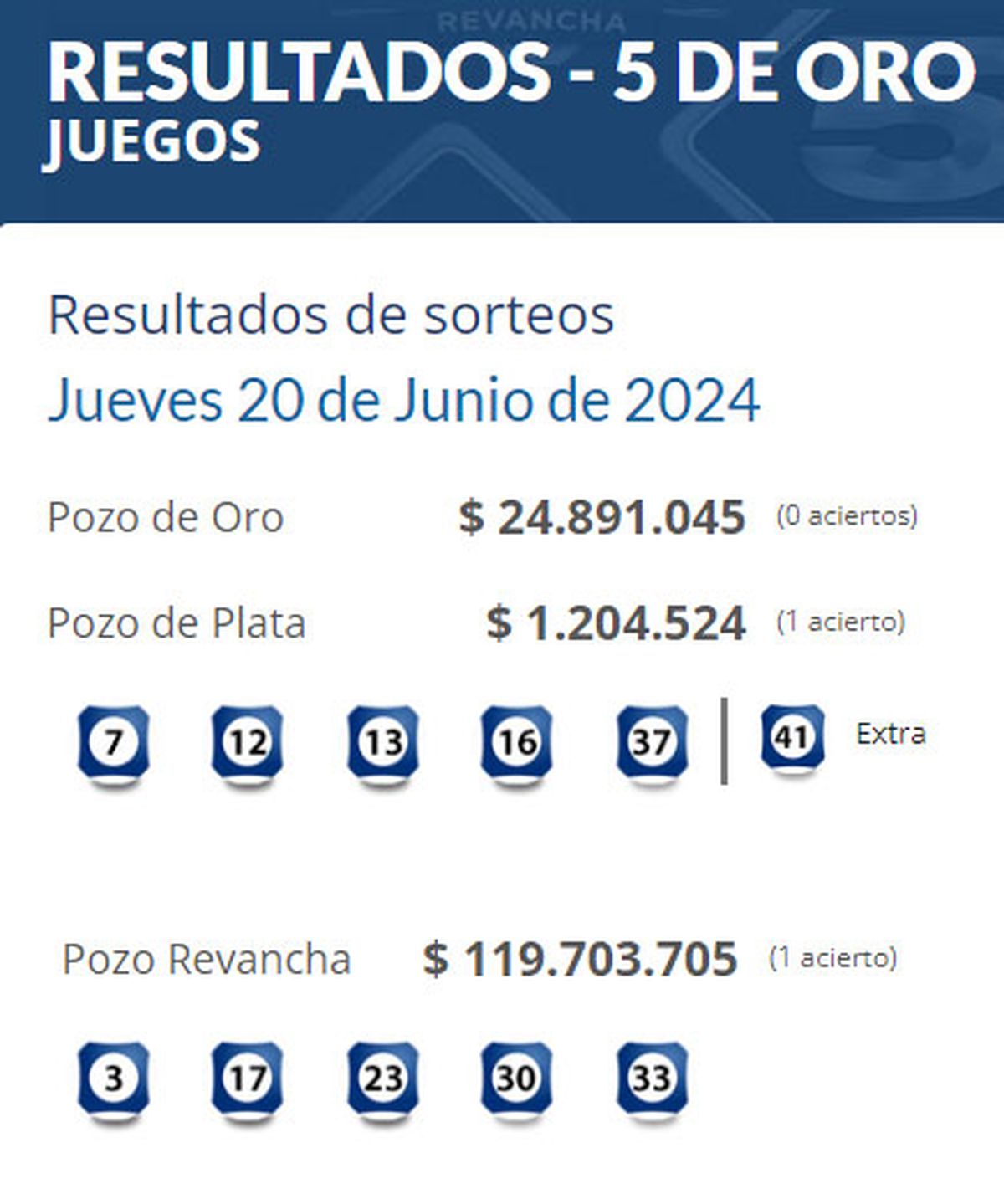 Finalmente salió, y con un solo acierto! El pozo revancha del 5 de Oro, que tenía un acumulado de casi 120 millones de pesos (unos 3 millones de dólares) obtuvo el jueves de noche un acierto, y ahora se espera por el o los ganadores (si es que se compró esa jugada de forma colectiva).