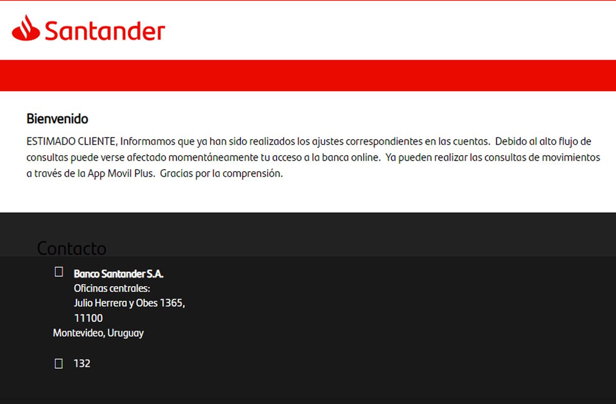 El banco indica en un comunicado que por la alta demanda de consultas puede verse afectado el ingreso a las plataformas digitales, pero que ya se puede consultar la App de Santander.