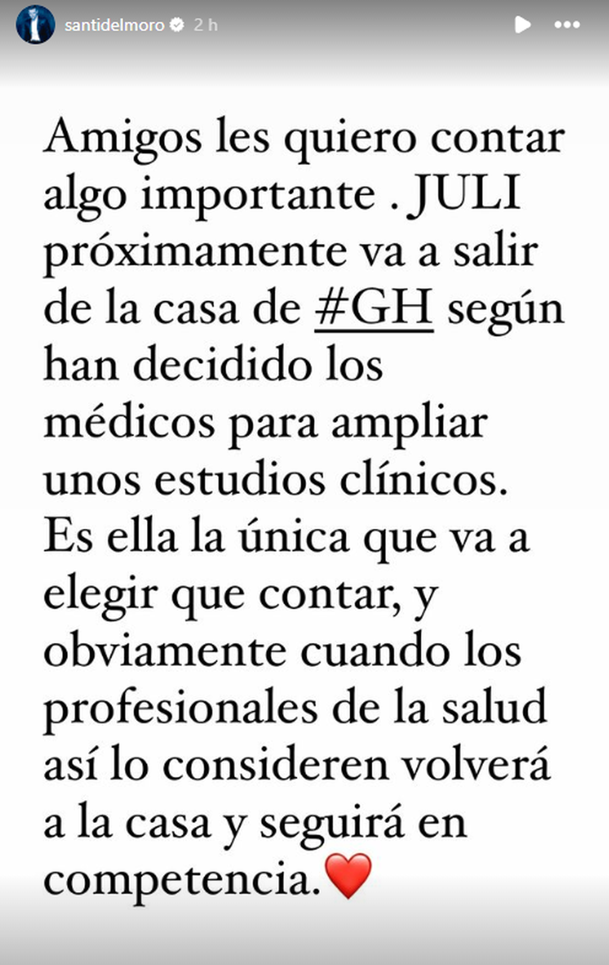 En una historia, escribió: "Amigos les quiero contar algo importante. JULI próximamente va a salir de #GH según han decidido los médicos para ampliar unos estudios clínicos. Es ella la única que va a elegir que contar, y obviamente cuando los profesionales de la salud así lo consideren volverá a la casa y seguirá en competencia (sic)".