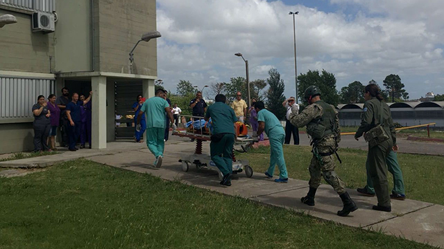 Foto: Momento en el que el piloto herido es bajado en el hospital Policial (Fuerza Aérea Uruguaya).