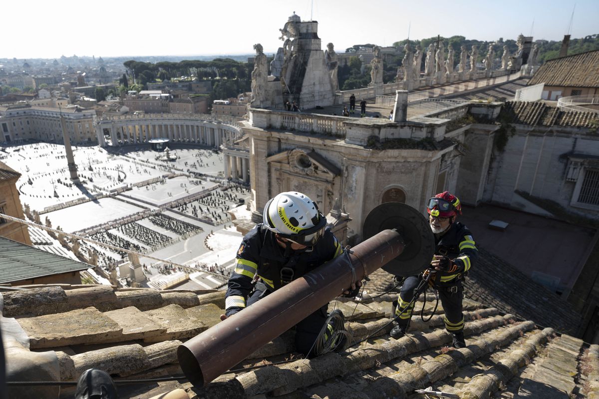 El video, fechado el viernes, también muestra a los bomberos trepando al techo de tejas para arreglar el conducto de la famosa chimenea que comunicará el resultado del cónclave: humo blanco si los cardenales ya eligieron papa y fumata negra en caso contrario.