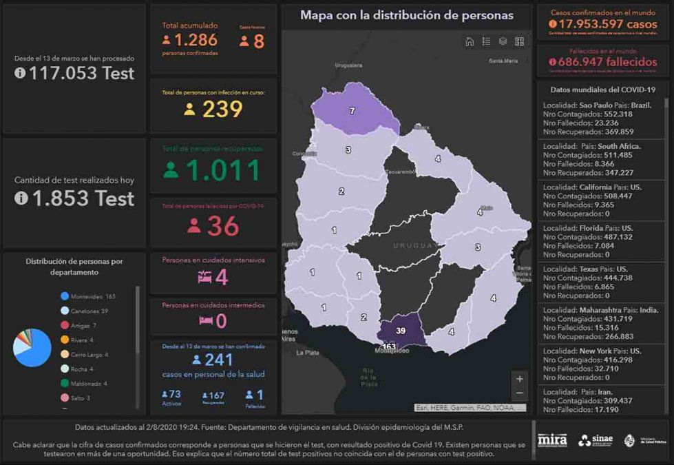 Actualmente hay 239 personas cursando la enfermedad y cuatro de ellas se encuentran en Cuidados Intensivos. Además son 15 los departamentos con casos activos: Artigas, Canelones, Cerro Largo, Colonia, Flores, Maldonado, Montevideo, Paysandú, Río Negro, Rivera, Rocha, Salto, San José, Soriano y Treinta y Tres.