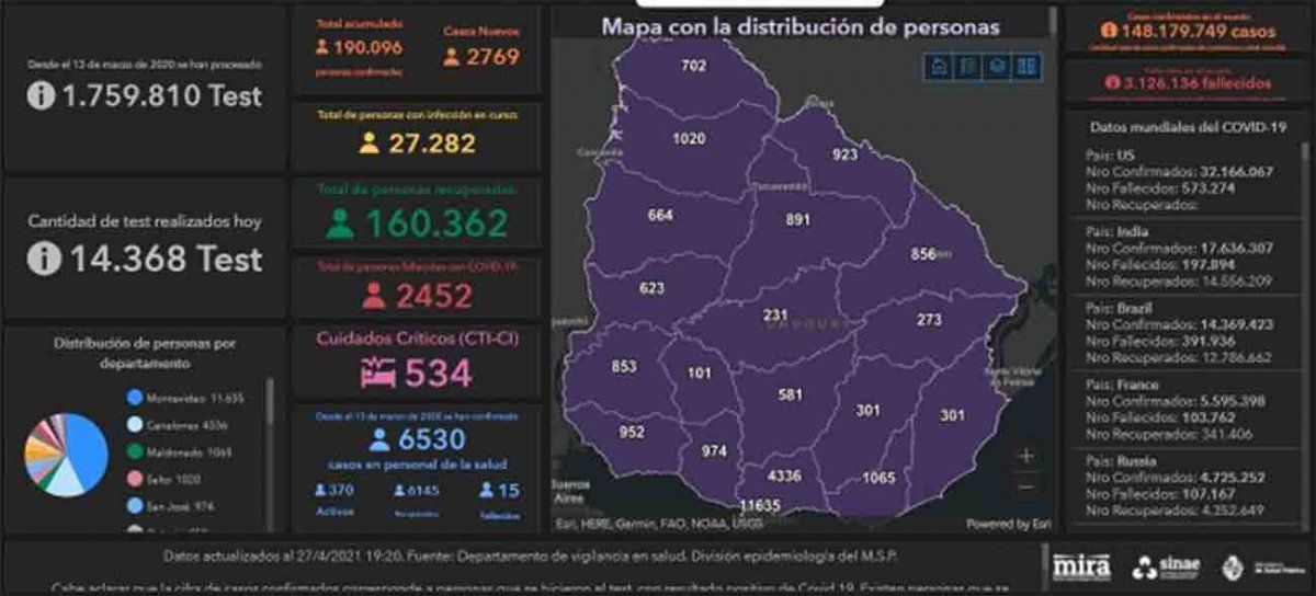 Uruguay registró este martes 2.769 casos nuevos de Coronavirus Covid-19, en una base de 14.368 análisis procesados; lo que da un porcentaje de positivdad del 19,27%.