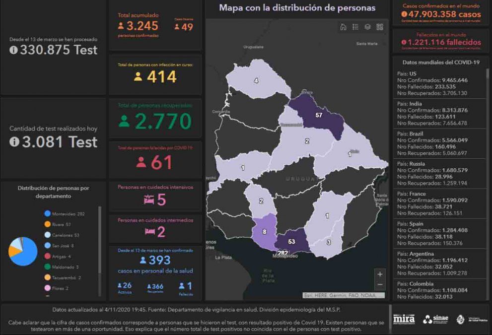 Este miércoles se registraron 49 casos nuevos de Coronavirus COVID-19, en una base de 3.081 análisis procesados, lo que da na cifra total de 3.245 casos positivos acumulados desde que comenzó la emergencia sanitaria. Del total de casos nuevos, 22 son de Canelones, 22 de Montevideo, cuatro de Rivera y uno de Flores. Asimismo, el Sistema Nacional de Emergencias (SINAE) reportó que hay 18 casos que corresponden a un brote de la Escuela Militar.