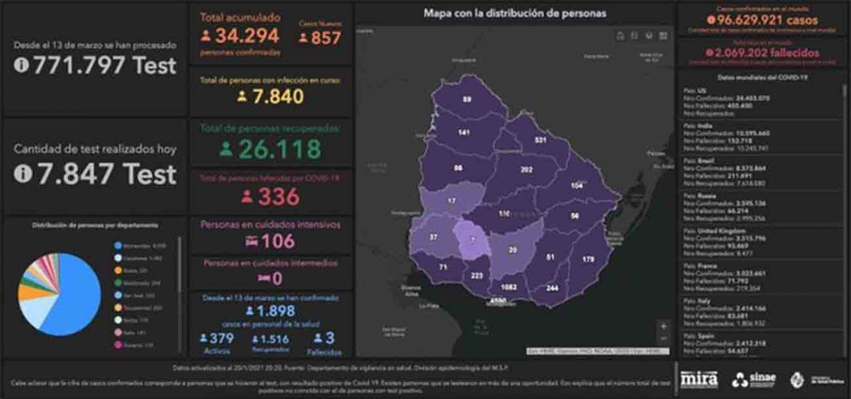 Uruguay registró este miércoles 857 casos nuevos de Coronavirus Covid-19, sobre una base de 7.847 análisis procesados, lo que da un porcentaje de positividad del 10,92%.