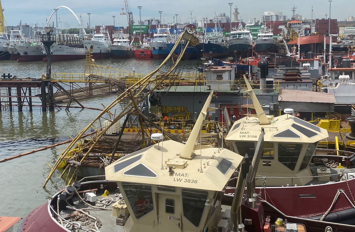 Así quedó una de las grúas que colapsó y cayó al agua y sobre otras instalaciones cercanas al dique: