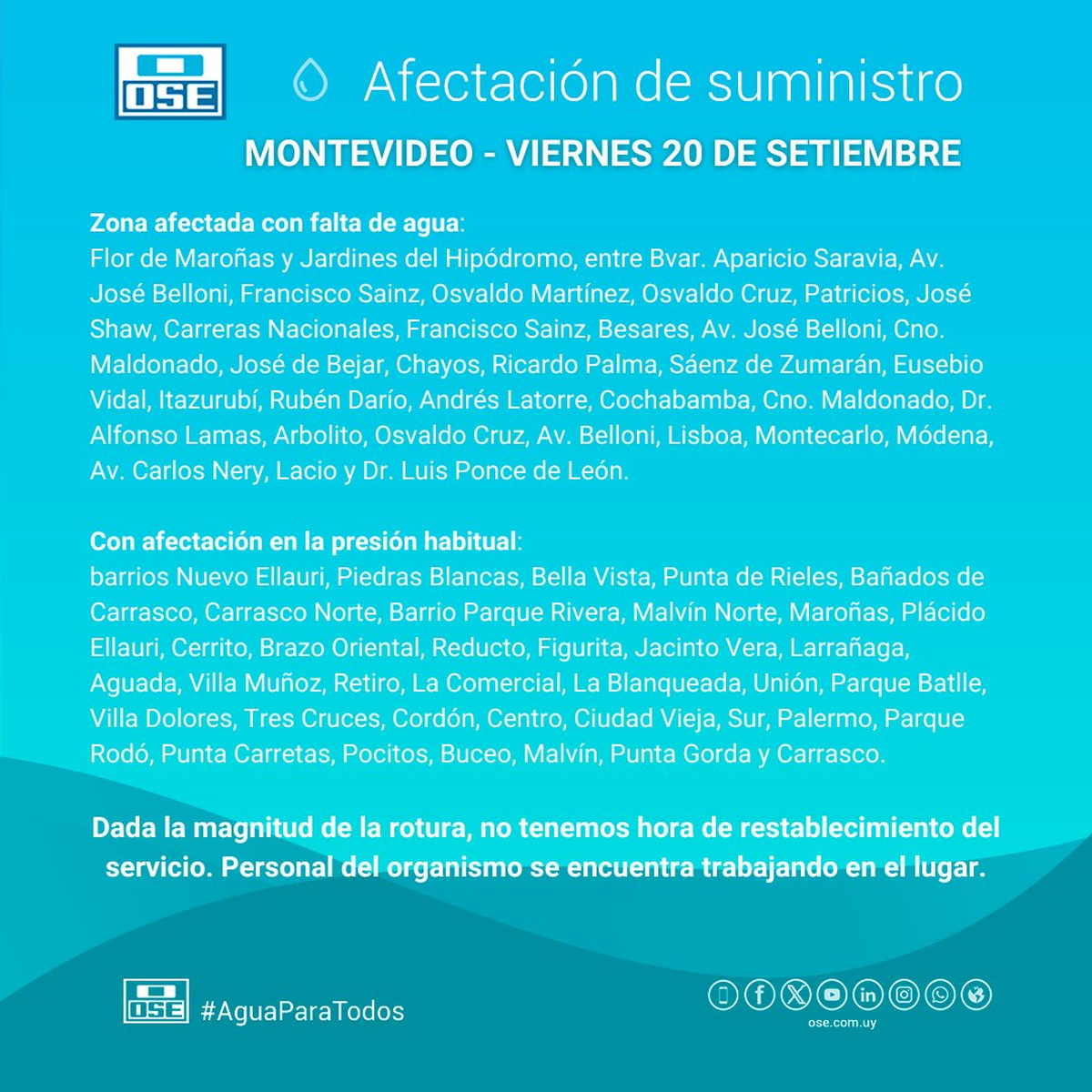 Además, se produjo “una afectación en la presión habitual de servicio a los usuarios de los barrios Nuevo Ellauri, Piedras Blancas, Bella Vista, Punta de Rieles, Bañados de Carrasco, Carrasco Norte, Barrio Parque Rivera, Malvín Norte, Maroñas y Plácido Ellauri; comprendidos entre las siguientes calles: Cno. Capitán Tula, Av. Don Pedro de Mendoza, Bvar. Aparicio Saravia, Rafael, Cno. Leandro Gómez, Cno. Maldonado, Cno. Punta de Rieles, Cno. Gigantes, Arroyo Carrasco, Av. Italia, Hipólito Yrigoyen, Cno. Carrasco, Veracierto, Av. José Belloni, José Shaw, José M. Guerra, Av. Gral. Flores, Av. Don Pedro de Mendoza, Bvar. Aparicio Saravia, Pedro Bazán, Cno. Leandro Gómez, Jacinto Trápani, Cno. Tte. Rinaldi y Óscar Bonaudi”.