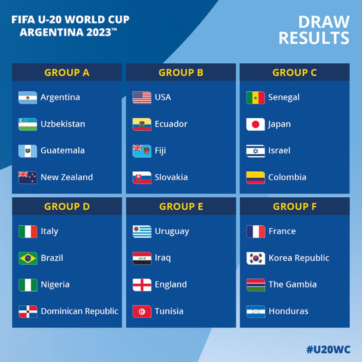 Este viernes la FIFA realizó el sorteo de los grupos del Mundial Sub 20 que finalmente se jugará en Argentina tras la cancelación de Indonesia como sede original, debido a que se negó a recibir en su territorio a la selección de Israel.