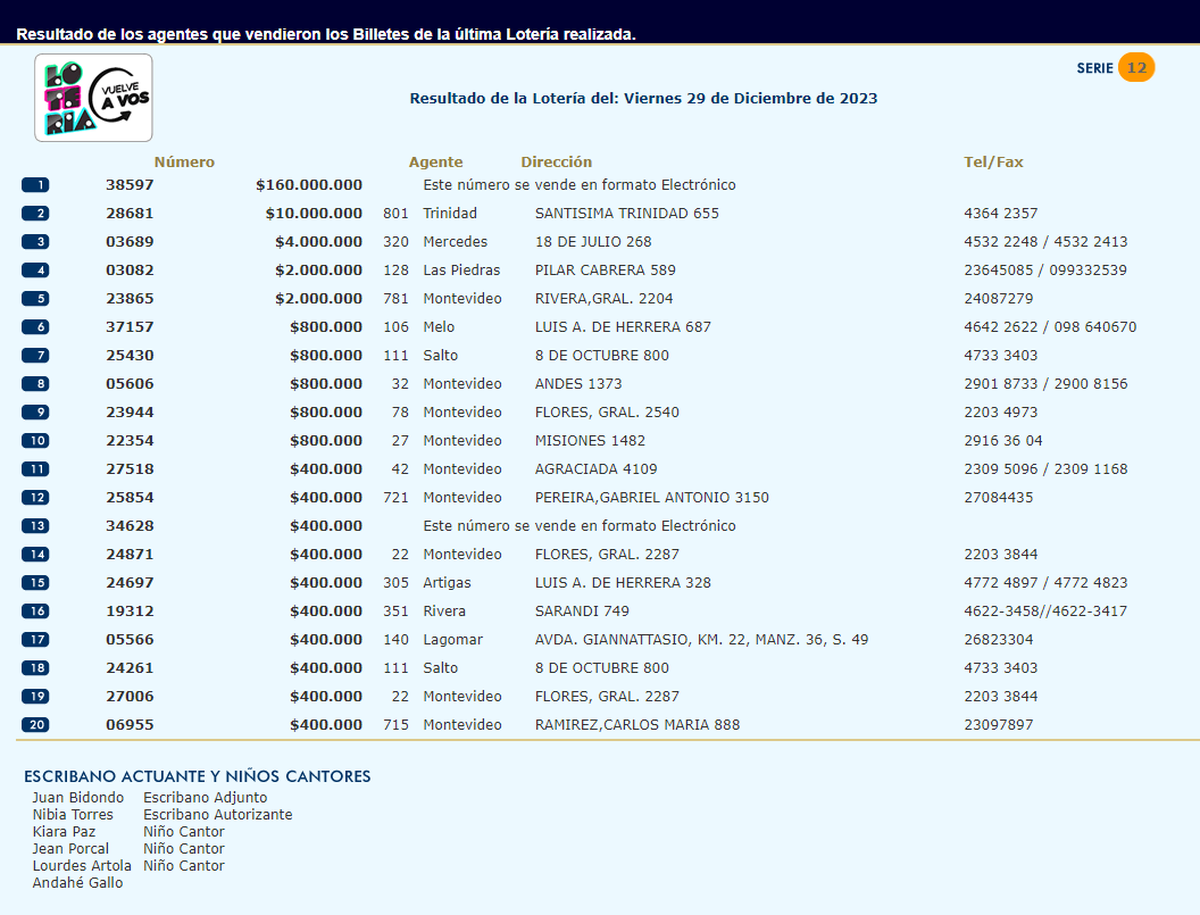 - 25.854 premio número 12 con 400 mil pesos.