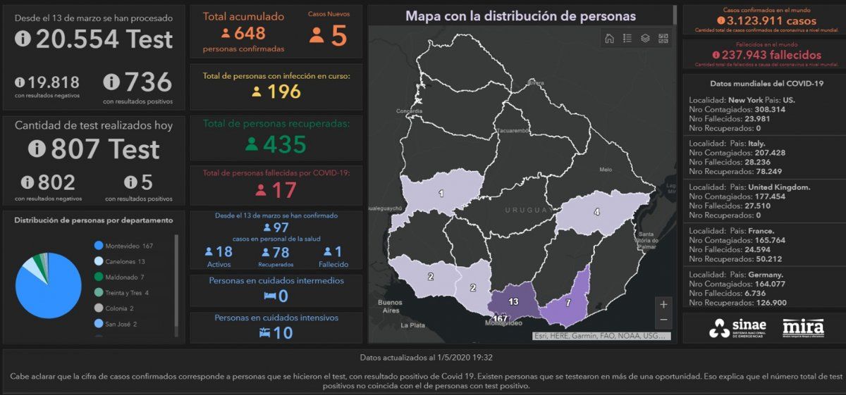 Uruguay sumó cinco casos positivos de coronavirus COVID-19 en la jornada de este viernes 1º de mayo, lo que da una cifra total de 648 casos positivos confirmados en todo el país desde que comenzó la emergencia sanitaria el 13 de marzo. Del total de casos, 435 ya se recuperaron y 17 personas fallecieron.
