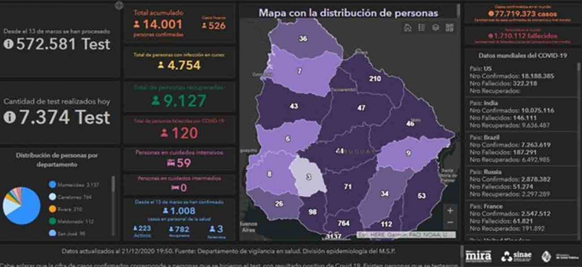 Uruguay registró este martes 526 casos positivos de Coronavirus Covid-19, en una base de 7.374 análisis procesados, lo que da una cifra total de 14.001 casos positivos acumulados desde que empezó la emergencia sanitaria en marzo.
