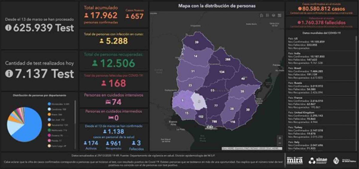 Uruguay registró este martes 657 casos nuevos de Coronavirus Covid-19, en una base de 7.137 análisis procesados, lo que da una cifra total de 17.962 casos positivos acumulados desde que empezó la emergencia sanitaria.