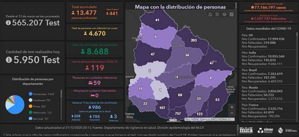 Uruguay registró este lunes 441 casos nuevos de Coronavirus Covid-19, sobre la base de 5.950 análisis procesados, lo que da una cifra total de 13.477 casos positivos acumulados desde que empezó la emergencia sanitaria.